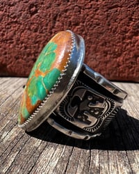 Hand wrought Heavy Ingot from repurposed early 1890s Sterling Silver, cold chiseled band, filed, old style Thunderbird stamp work and crowned with a beautiful vibrant High Grade American Turquoise. Built to last generations!