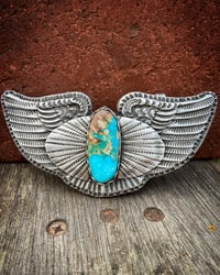 This buckle was Handmade entirely with forged repurposed 1890s 925 Sterling Silver. Super heavy (213 Grams) and sturdy, carefully hand crafted, layered, filed & stamped. Crowned with a Gem Grade Blue Earthy Otteson Bros Natural Royston Turquoise (40mm) Old Style classic and built to last generations.