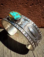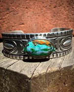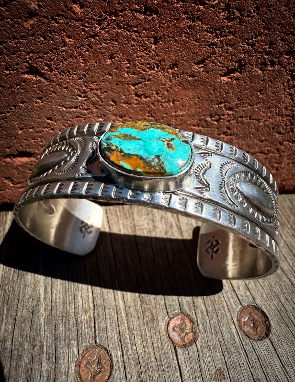 Handmade Ingot Cuff (3/4 width) forged from repurposed 1890s 925 Sterling Silver with heavy old style repoussé stamp work & crowned with a stunning Natural Blue Royston Ribbon. Timeless Classic! Built to last generations.