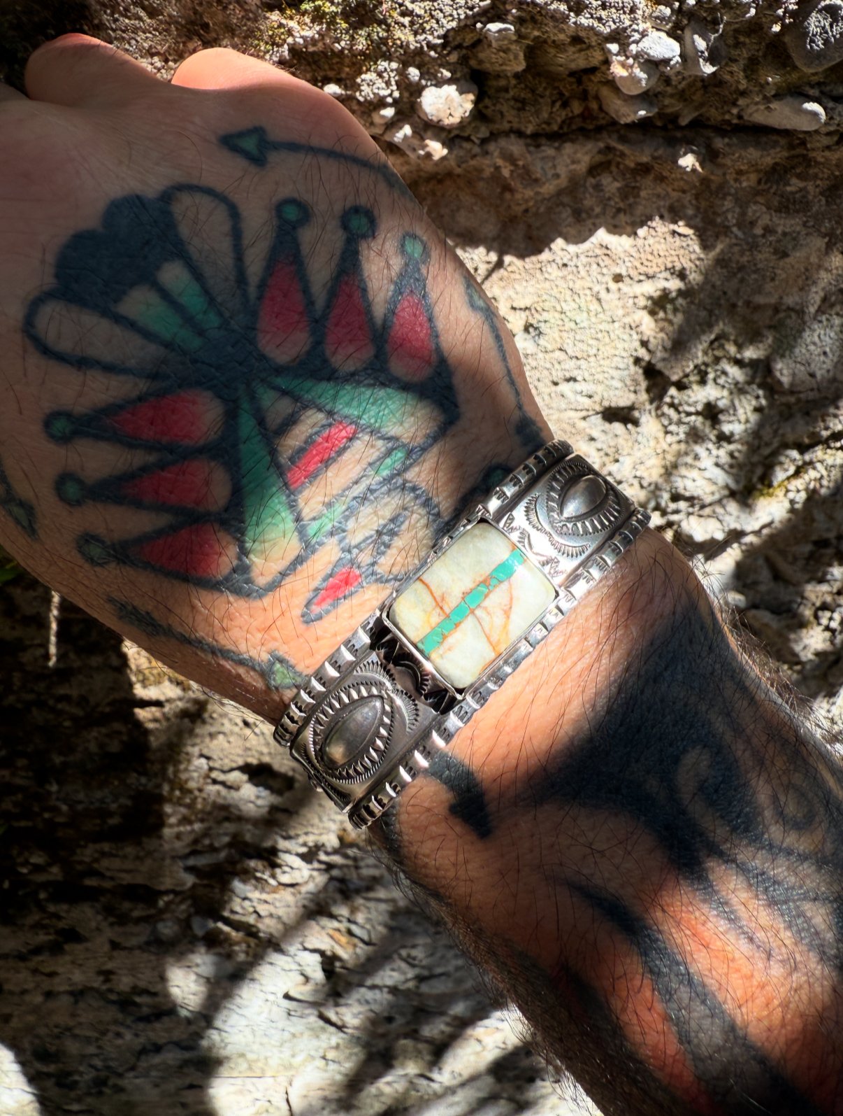 Handmade Ingot Cuff (3/4 width) forged from repurposed 1890s 925 Sterling Silver with heavy old style repoussé stamp work & crowned with a stunning Natural Royston Ribbon. Timeless Classic! Built to last generations.