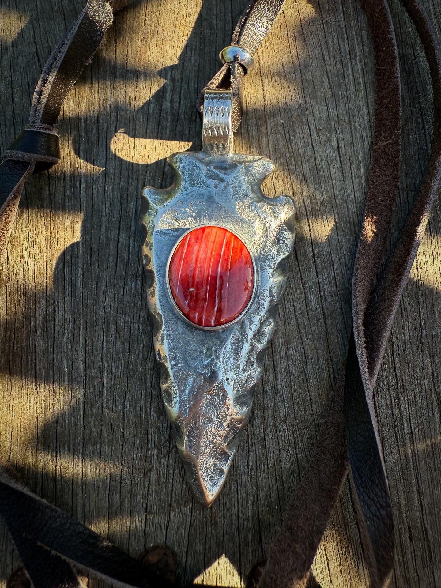 WL&A Handmade Large Sterling Silver Red Sponge Coral Arrowhead Pendant - Sz 3.5" - 95 grams - Deer Leather 26" with Handmade 9mm Bench Bead (available website profile link)