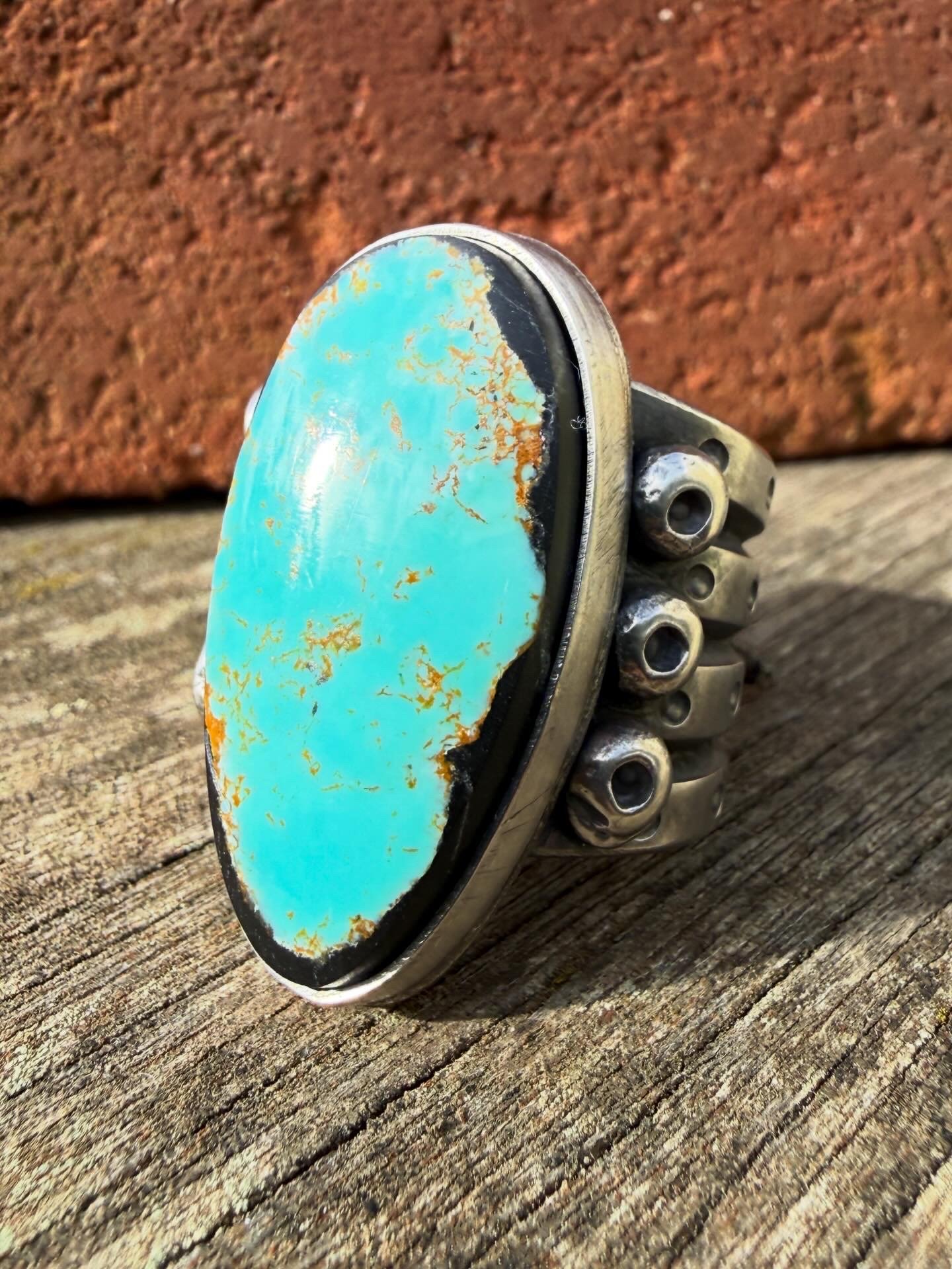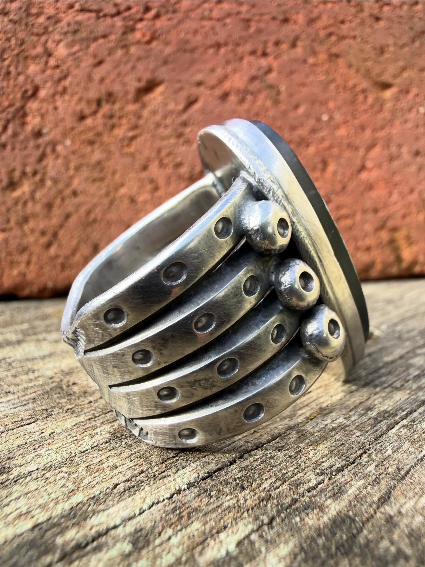 HEAVY old style unisex piece. Hand wrought Ingot from repurposed early 1890s Sterling Silver, cold chiseled split band, stamped, layered with peyote buttons, filed and crowned with a beautiful High Grade Natural Black Jack Turquoise. Built to last generations!