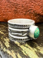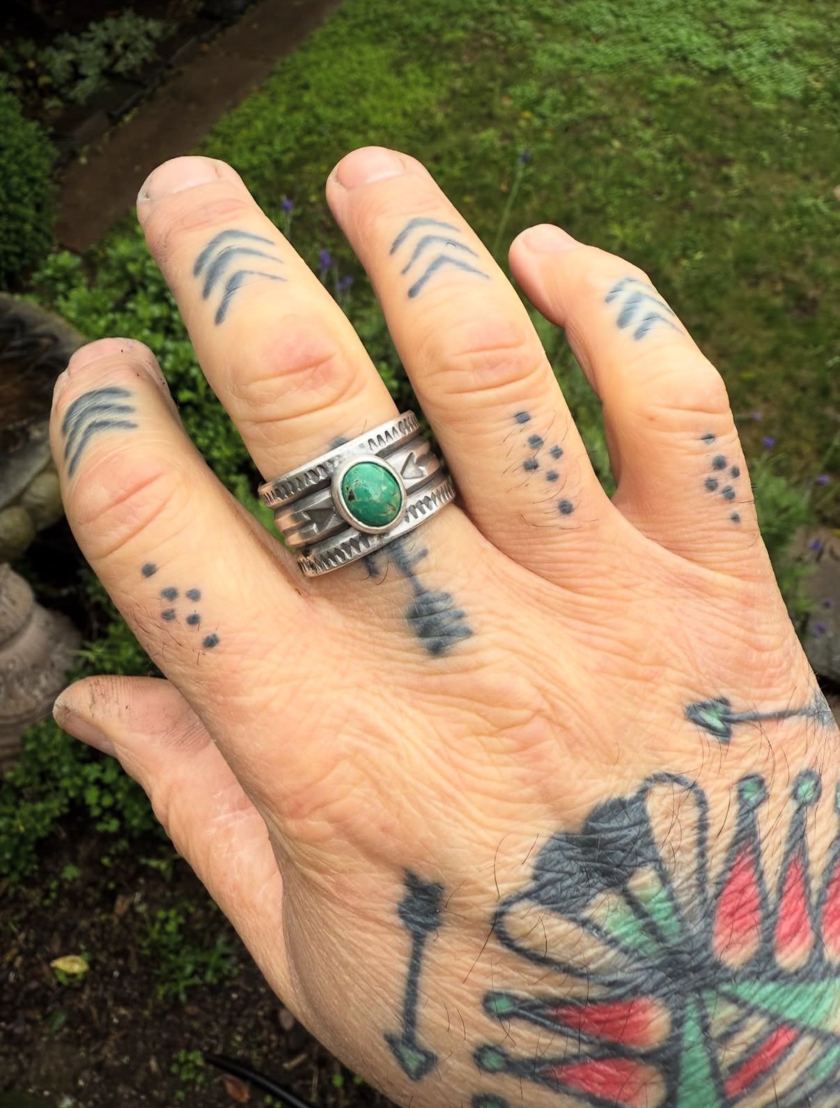 Hand wrought heavy Ingot (1/2 wide) from repurposed early 1890s Sterling Silver, cold chiseled, stamped, filed and crowned with a beautiful American High Grade Royston Turquoise. Built to last generations!
