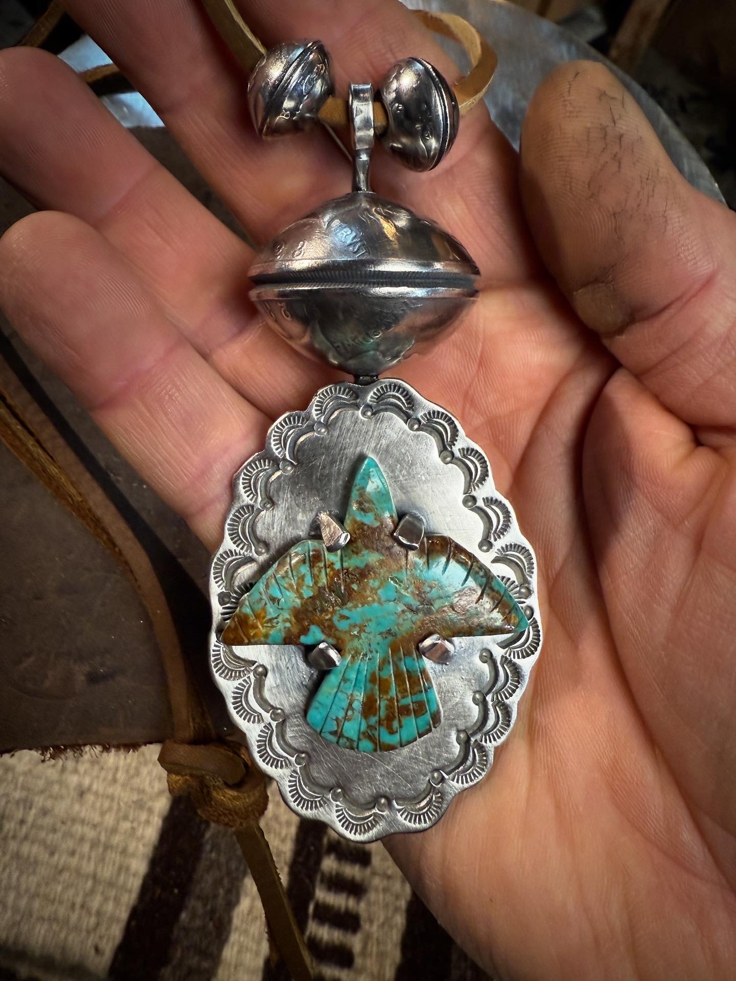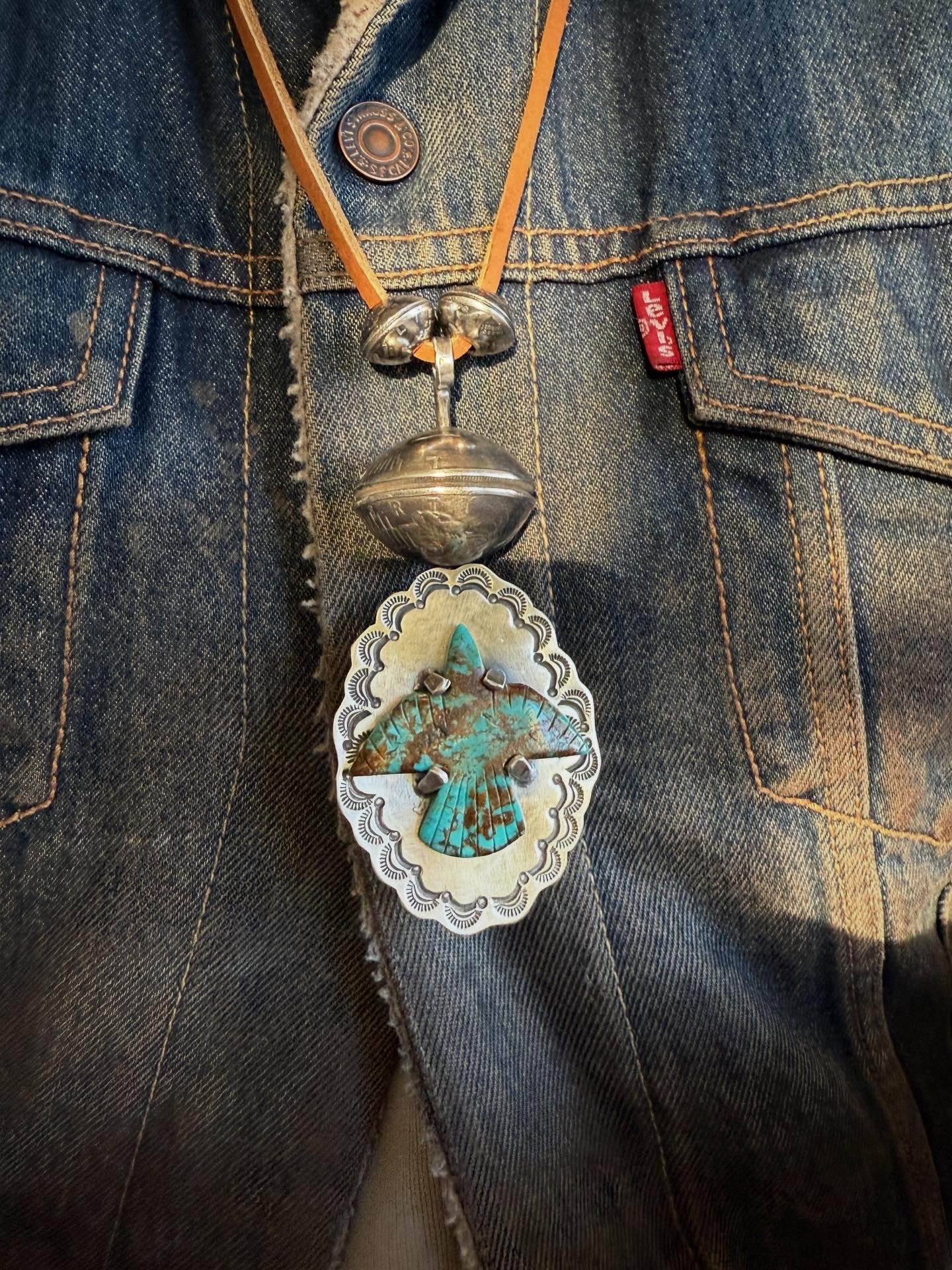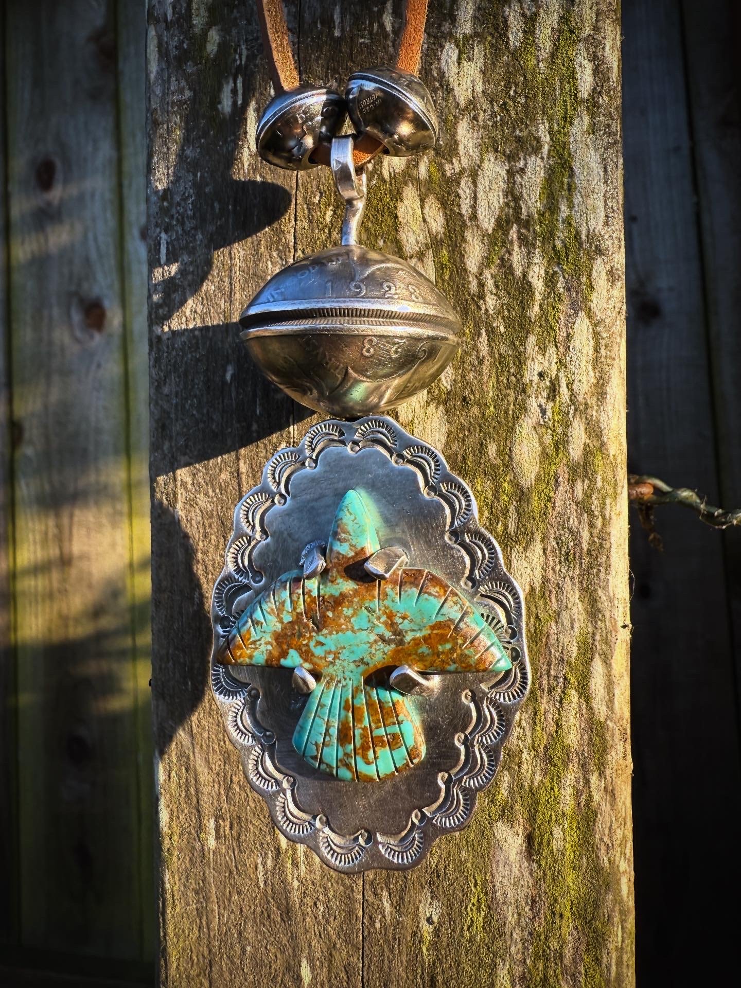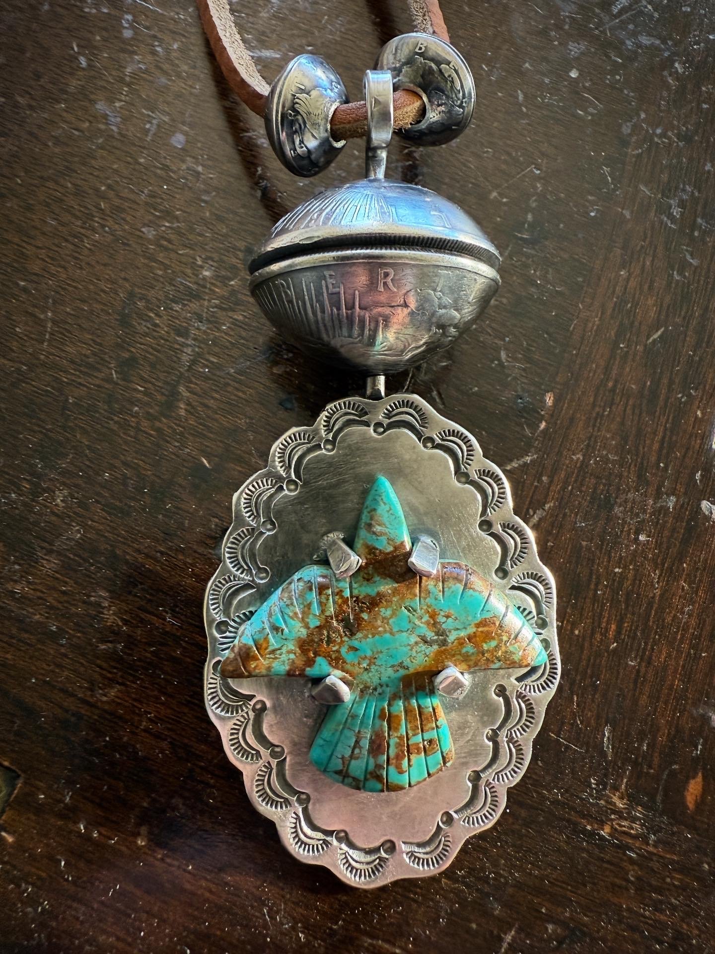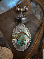 Handmade Royston Thunderbird Turquoise Pendant set on .925 hand wrought, tooled & stamped base. The Sterling Silver Bezel is adorned with rotating XL Peace Silver Dollar (dates codes 1923) pearl. Strung on 26" adjustable deer leather with two (2) handmade Silver Mercury Dime pearls. Old Style classic and built to last generations.